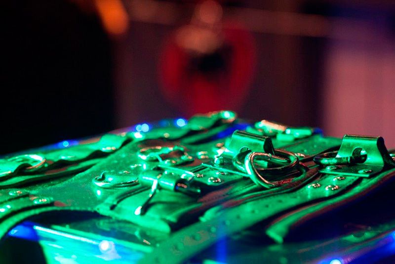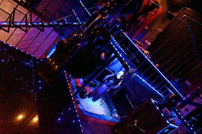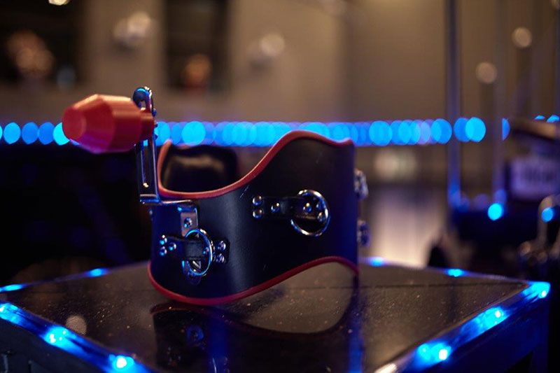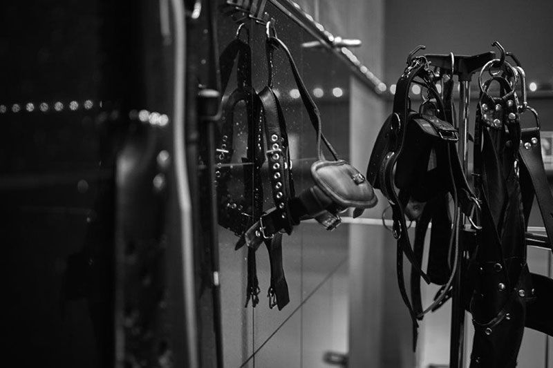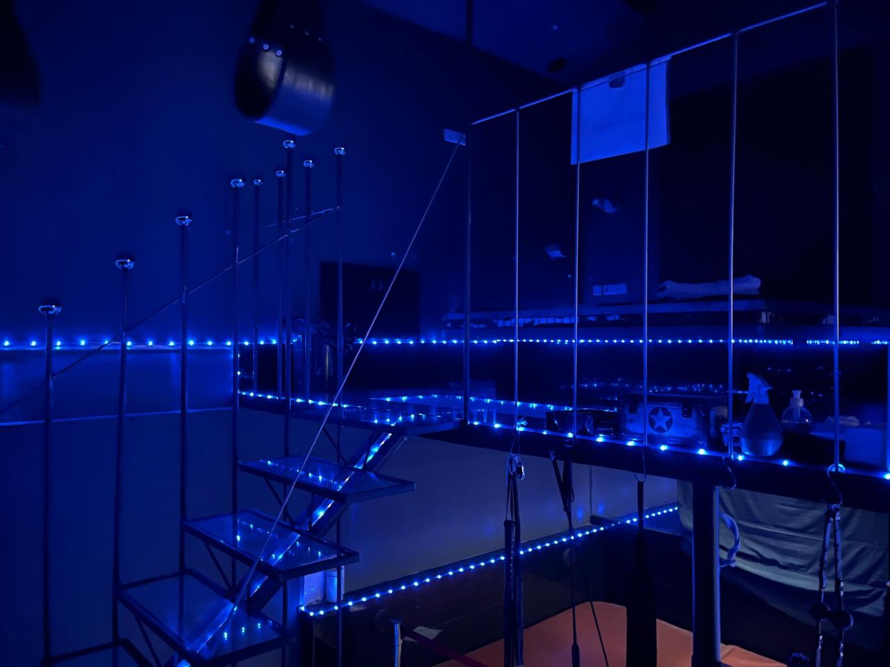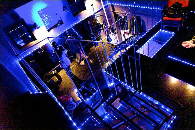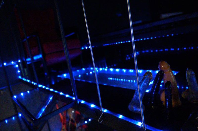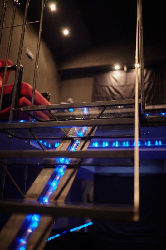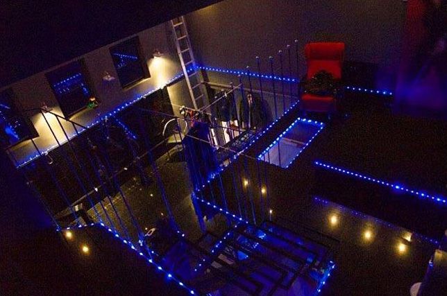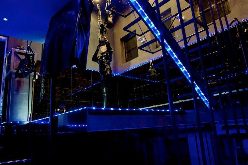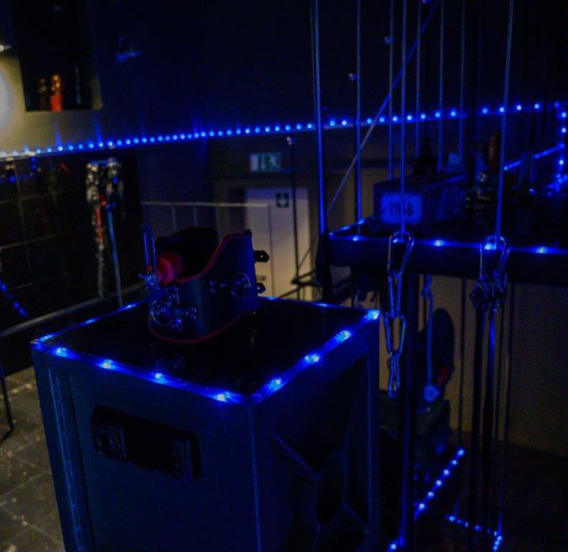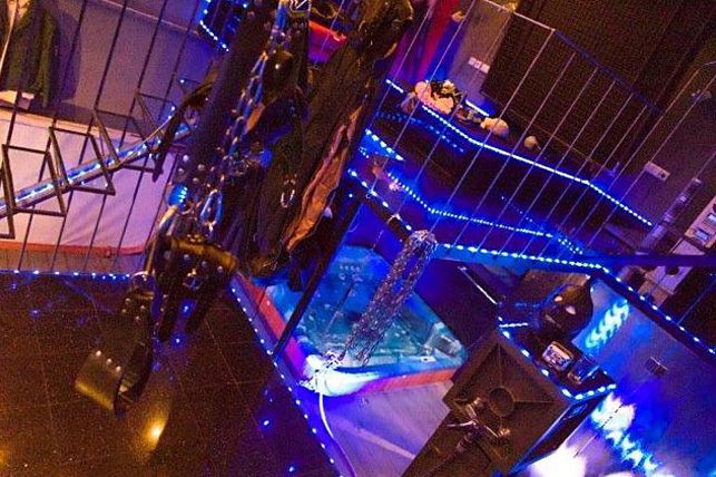 Vor dem Lederfesselbett in der vierten Ebene liegt ein Glasträger, durch den man in die zweite Etage und den Gefängnistrakt blicken kann. Die verspiegelte Rückwand und die versteckten Bodenlöcher laden ein für spezielle Anwendungen. Ideal für Übernachtungen/Langzeit, Vakuumbett, Folienwickelungen , Mumifizierungen etc.